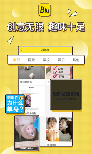 Biu神器是一款由广州华多网络科技有限公司开发的视频图片制作APP。Biu神器是一款多功能手机神器,软件拥有表白,恶搞,炫富,p图,斗图等诸多功能,可以让广大用户朋友更开心生活娱乐,Biu的一下让你获得更多赞!下载Biu神器,就等于下载了一个斗图神器,表白神器,恶搞神器,小视频神器。还犹豫什么,快来下载吧!