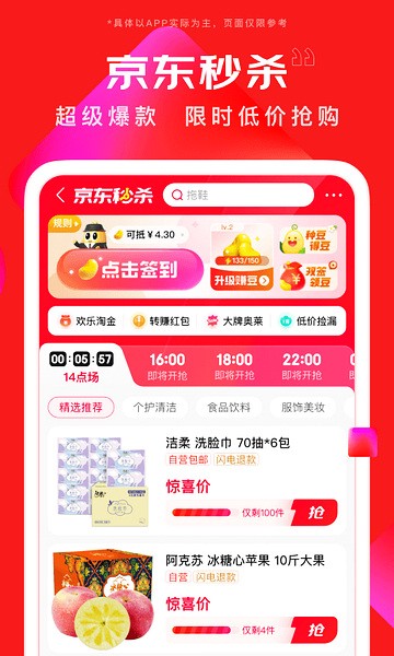 特有明星级抢购栏目-掌上秒杀、专享活动、预售爆品、限时特卖,手快有,手慢无。
