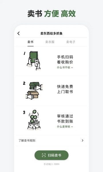 有闲置书籍要处理?在多抓鱼 app 内直接扫描图书 isbn 码,即时查看书籍收购价。下单后快递上门取书(到付),多抓鱼收到书并审核通过后,即刻打款,方便无负担。