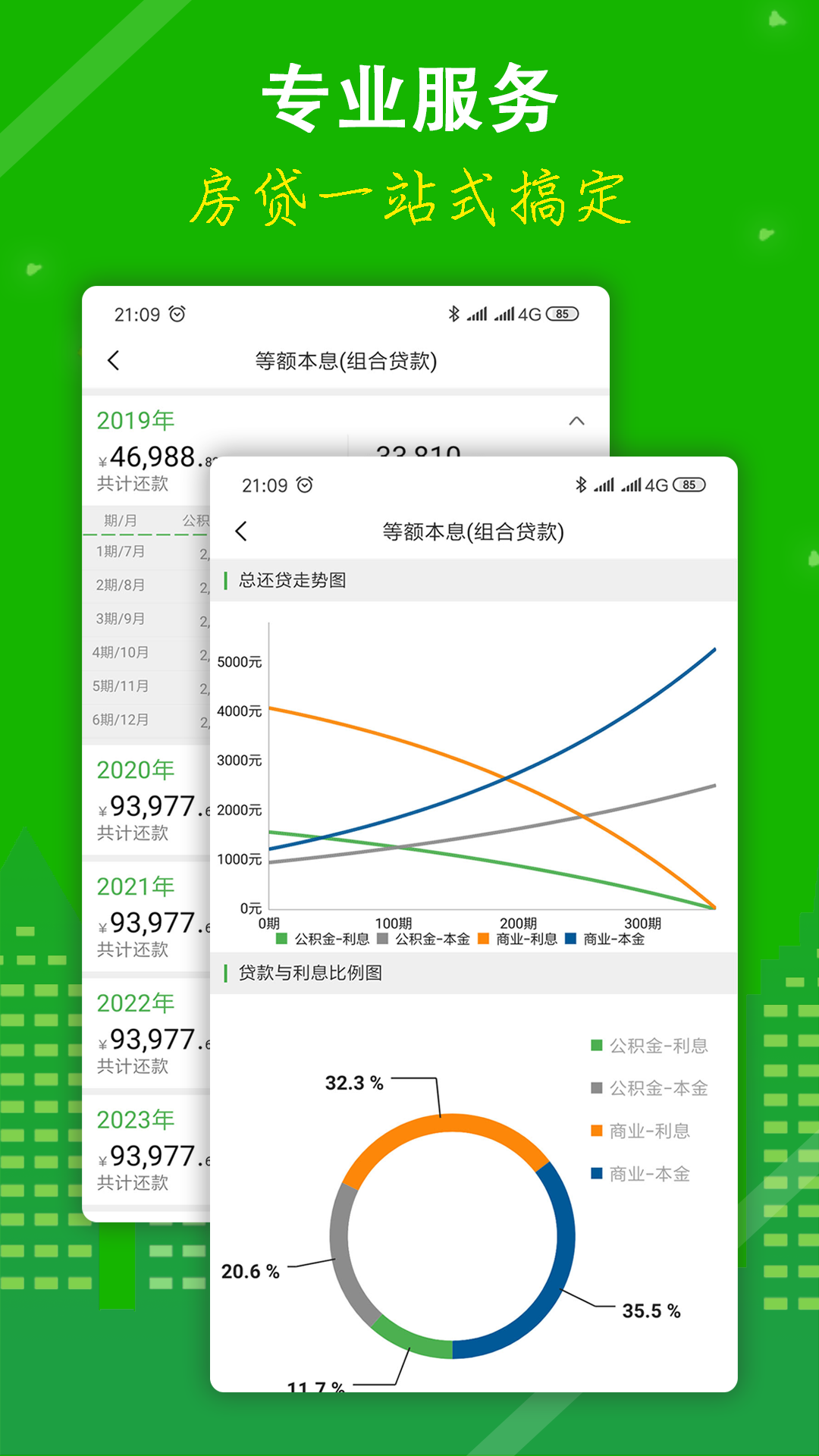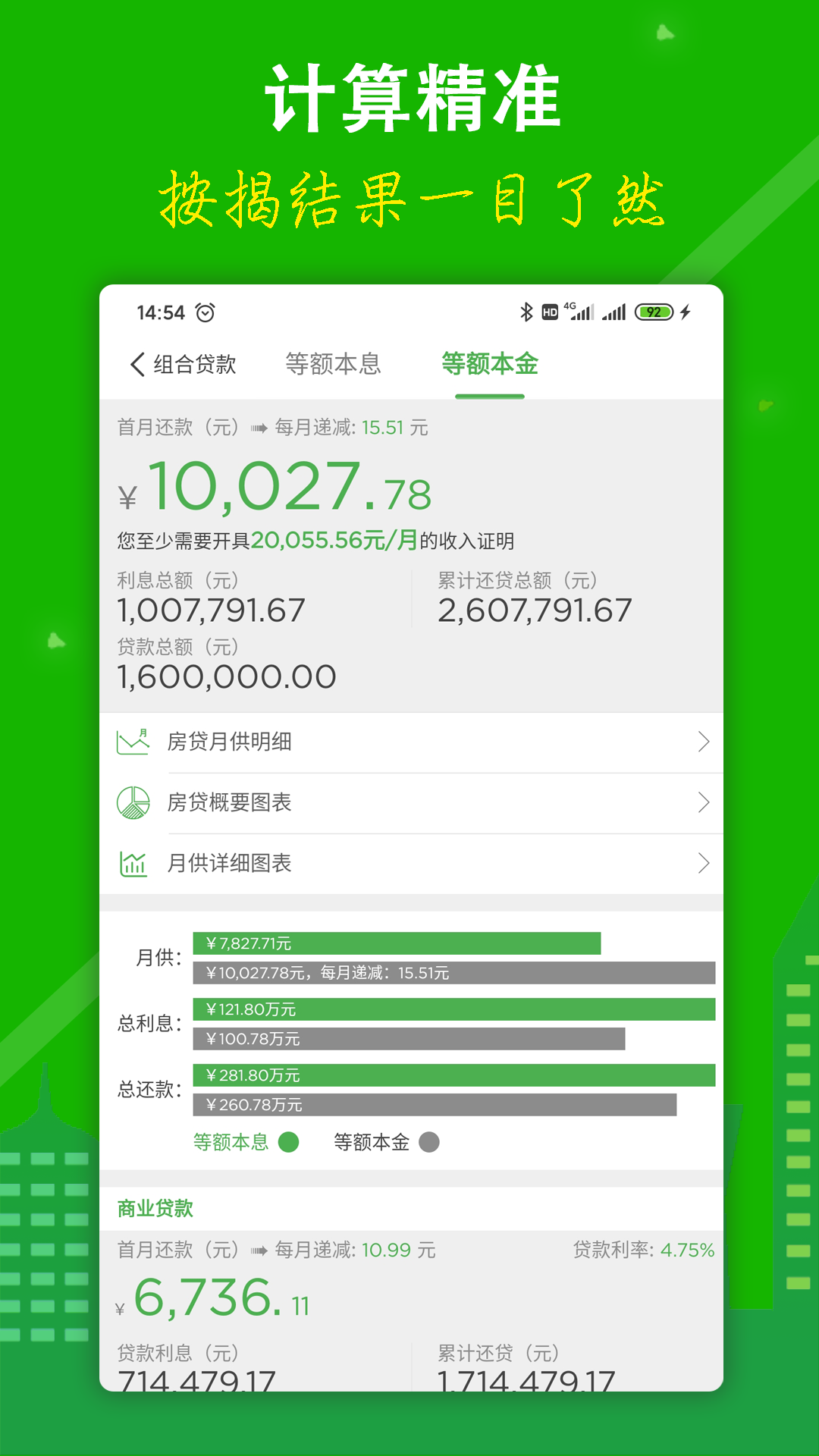 提供每月详细的等额本息和等额本金的商业还款报告/公积金还款报告/总还款报告。更为直观的统计报表及月供图表,一目了然的月供数据,让您的更清晰直观了解数据。