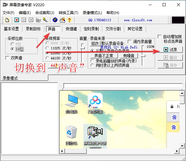 9、录制时可以设置是否同时录制声音,是否同时录制鼠标。