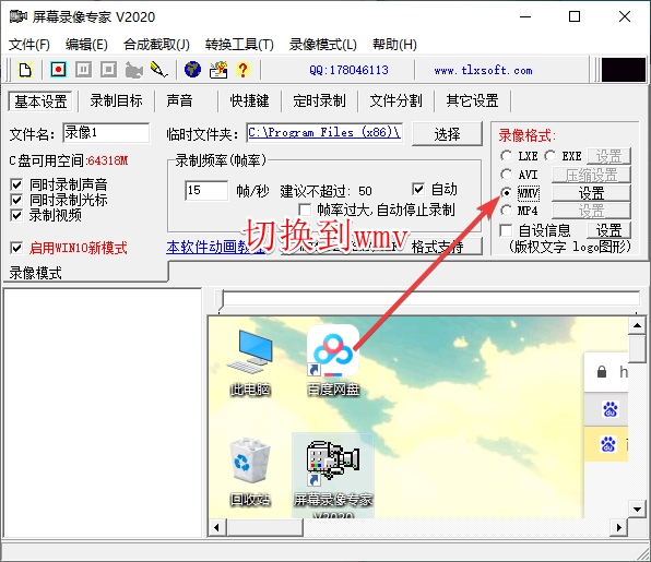 1、打开软件,在“基本设置”中,最右边,选择录制生成的格式为“wmv”。