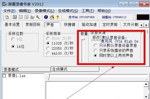 3、在声音录制中可以选择是录制电脑本身的声音还是录制麦克风传入的声音,或者两者都录制。