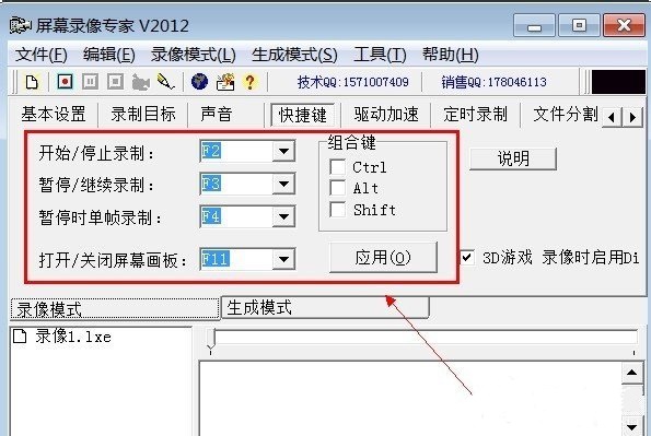 4、界面切换到“快捷键”,对开始、停止、暂停、继续的快捷方式进行设置,建议设置成自己熟悉的,因为录制视频的时候,遇到突发状况,需要对视频进行暂停录制。