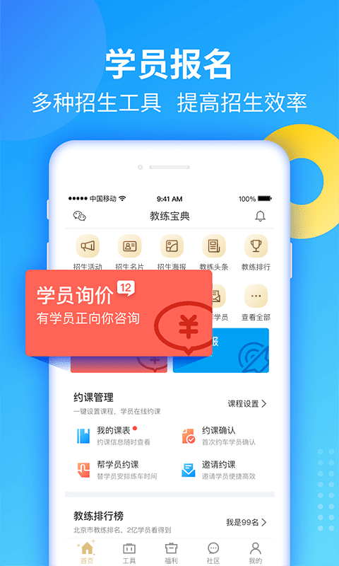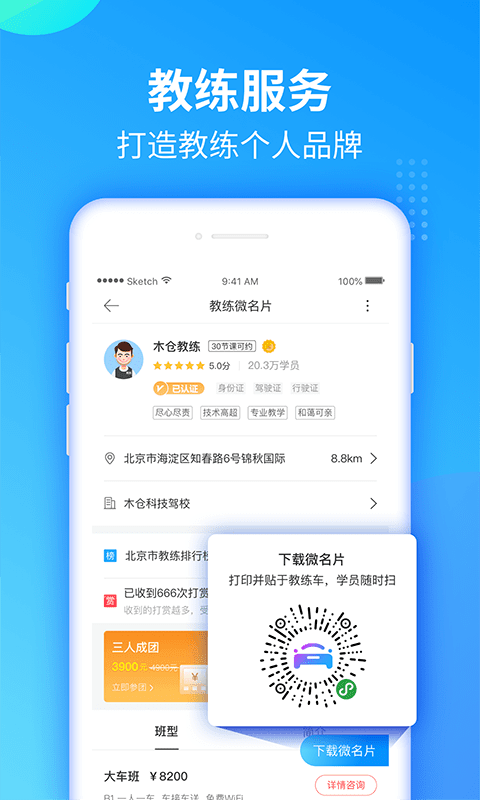 2、拥有招生名片,通过应用教练可以快速生成自己的招生名片,方便招生;