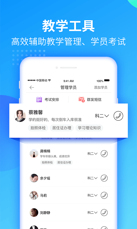 教练可以通过手机实现随时随地查看约课日历、约课记录、约课评价,在线排课,学员在驾考宝典App一键预约,多端协同操作,全面智能化管理,练车日程一目了然。并可实时通知学员考试安排,及时掌握考试结果,提高驾校管理效率。