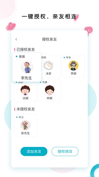4、在授权亲友页面,就能自行添加亲友,一起管理宝宝
