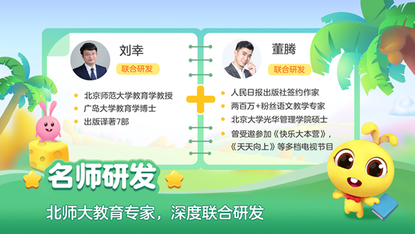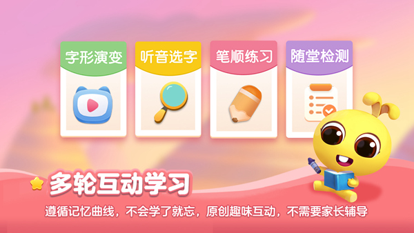 名师研发——由早期儿童教育专家耿华和语文教育界知名认证专家董腾联合研发,专为3-8岁的儿童设计。课程基于“多感官教学法”设计“认-练--写-测-拓展”的识字环节,孩子通过“眼看”,“耳听”,“手动”,“嘴念”,“脑想”等多感官,多维度感知字词;同时,辅以“成语故事,国学启蒙,古诗”等字词运用环境,结合动画视频,游戏化教学模式,同步进阶,由易到难。帮助孩子趣味高效地学习汉字。