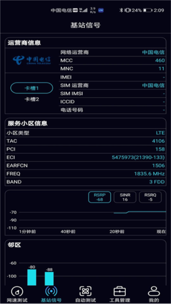 6、接下来是基站信息查看,不需要root就能查看基站信息,包括SIM卡信息,小区信息,小区信号质量等,可以通过这个信息,找到最佳信道,然后强制锁定信道,让手机信号更好,网速更快,当然了,这个需要专业的工具以及root来选择。