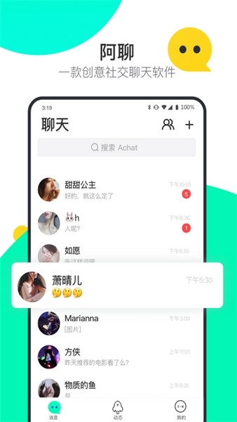 阿聊聊天软件最新版本是一款非常安全的在线交友聊天app,它的功能是很简单的,用户可以在这里发布动态来让更多的人看到自己分享的内容,同时也可以通过口令来添加好友。在消息列表中可以快速查看和回复消息,同时它的界面非常整洁,也没有多余的功能。此外软件还有消息已读显示,并且在对方截图聊天记录的时候还会提醒你。