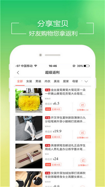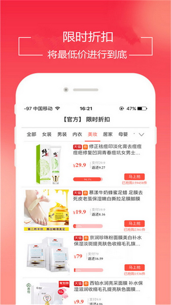 5、每天10点更新千款超值低价商品,9.9元包邮、29.9元包邮、限时折扣、好品库等,涵盖服装、鞋包、居家、等16大品类。女装、百货、美食低至1折!万款商品拥有内部优惠券,全部经过真人质检。