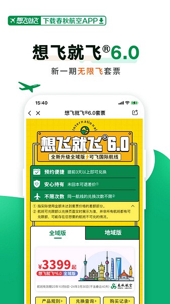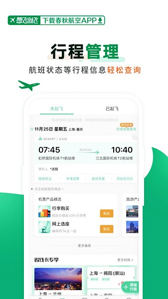 春秋航空APP是一款在线订购机票软件,拥有多种功能,以其多功能性而备受瞩目,涵盖了出行前、中、后的各个方面,让用户在整个旅途中体验到更为便捷、实惠的服务。其中囊括国内外及地区的机票预订、各地酒店预订、查询航班动态等,除优惠机票限时抢购外,还有机票加酒店特价套餐经常推出,让你出行更优惠,同时还支持机票验真,真假快速辨别,如果遇到特殊情况不能出行,软件还支持在线退票、改签,非官方渠道购票也能退,灵活快捷方便每一位用户。