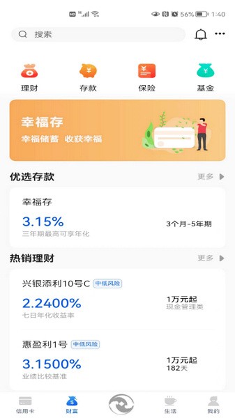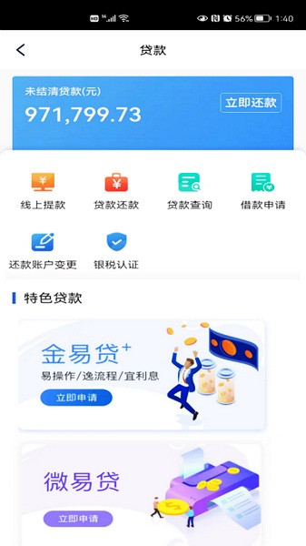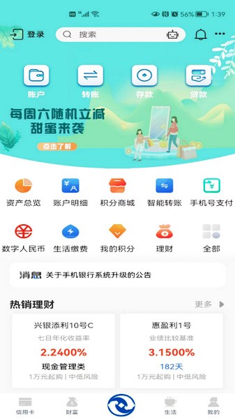 2、进入首页用户可以进行转账汇款、理财产品、个人贷款和存款等多种业务,