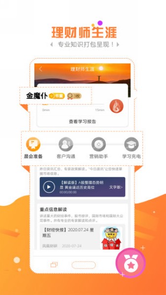 金魔仆app是一款专门针对营销的金融服务应用软件,在这里,不仅可以直接进行直播观看,让你能够在线互动学习,同时支持签到功能,可以为你实时记录以及督促你的学习进度,而且能够进行语音播报,让你在上班亦或者跑步的时候也可以进行有效学习,除此之外,你还可以直接在搜索框之中搜索自己需要的相关内容,各种针对营销的知识全方位为你进行提供,满足你多样化的各项学习需求。