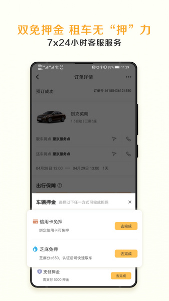 绑卡或芝麻分600分及以上,享受租车预授权+违章押金双重免押服务