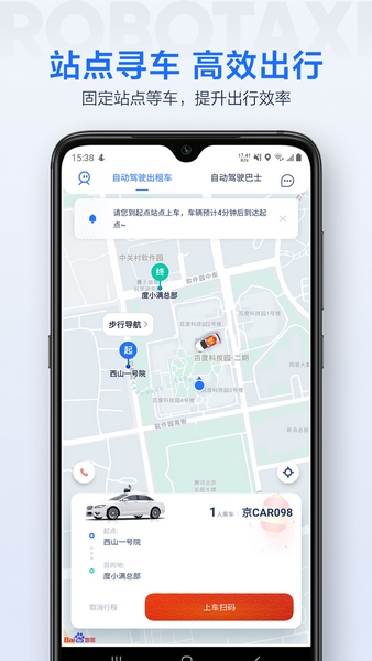 萝卜快跑提供一键叫车、步行站点导航等自动驾驶出行服务,页面简洁、操作简单,为乘客带来前沿自动驾驶科技的优质体验!