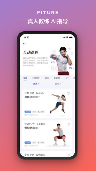 fiture app是一款非常专业且实用的科学健身软件,软件内主要是以ai为核心元素,里面的教练都是智能ai指导,采用了最新的ai技术,为用户提供了集智能科技健身硬件、丰富顶级健身课程、AI教练专业指导、专属定制训练计划、高级垂直健身社区、一对一针对性服务在内的科技健身方式产品和服务。而且fiture还会为每一个用户打造专属的健身方案,让每一个人都能更有针对性的训练,同时还会有各种丰富的健身课程来帮助大家快速了解健身时的小技巧,让大家科学健身,快乐生活。目前软件内已经涵盖了HIIT、力量塑形、瑜伽、普拉提、有氧舞蹈等在内16大类、超过3000节课程的制作,还有一百多个运动专题,满足不同用户们的使用需求。