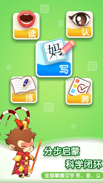 辨认字形、跟读字音、笔画书写、趣味练习,每个字都分多步进行教学,让孩子全面掌握汉字的形、音、义。