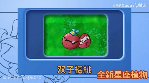 双子樱桃:对3*3范围的僵尸造成1800点的爆炸伤害,并将炸死的的僵尸转化成3颗跟踪星星子弹