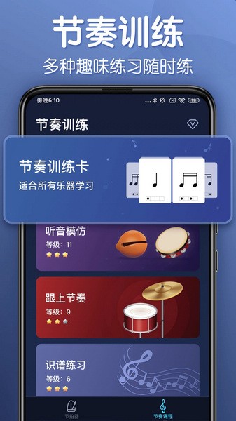 1、专业乐师设计,节拍准确稳定,保障用户的节奏练习,很专业;
