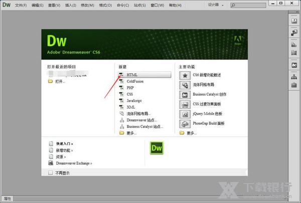 打开Dreamweaver CS6应用软件后,点击欢迎屏幕上的新建HTML,如下图所示。