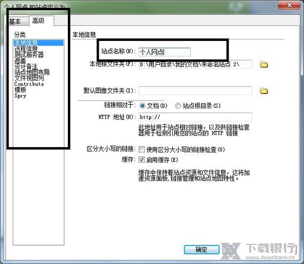 6、该将对话框切换到“高级”选项卡,在左侧“分类”下选择“本地信息”,在右侧“本地信息”的“站点名称”项输入“个人网站”。