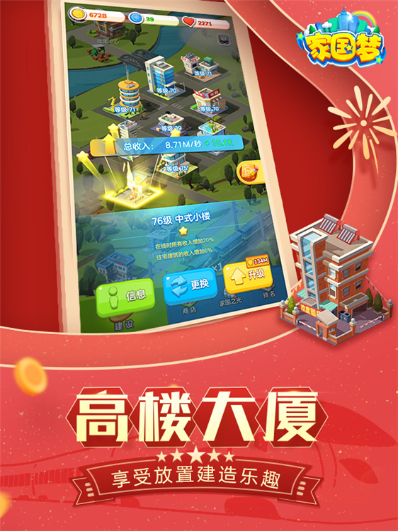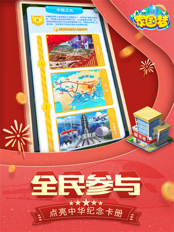 家国梦是由腾讯追梦计划和人民日报中央厨房碰碰词儿工作室联合推出,天美工作室群研发的一款展示新时代国家发展的,休闲放置建设类游戏。在自主建设的城市内轻松乐翻天,了解扶贫攻坚、绿色出行、减税降费等政策,一步一步共建家乡和祖国,还能感受祖国大江南北的地域文化特色,诸如北京烤鸭、兰州拉面等等;更有300+张家乡实景绘图。快和朋友们一起,实施最合适的政策,完成城市发展任务。