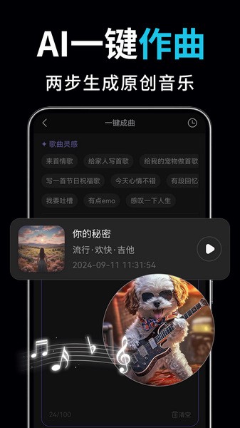 2、一键成曲功能:新增了一键成曲功能,用户可以轻松创作出个性化的音乐作品,让每个人都能成为艺术家。这项功能不仅丰富了应用的功能,也为用户提供了更多的创作可能性。