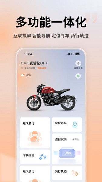 motoFUN是一款专为摩托车车主准备的智能车载软件。这款软件可以关联用户的摩托车,将车辆的信息同步到软件上,随时都可以查看最新的车辆状况,可以远程控制摩托车的部分功能。同时,用户可以借助这款软件来快速定位寻找摩托车,具体的位置信息会显示在地图上。此外,用户在驾驶时可以打开软件的导航功能,定位目的地后开启导航,辅助驾驶。
