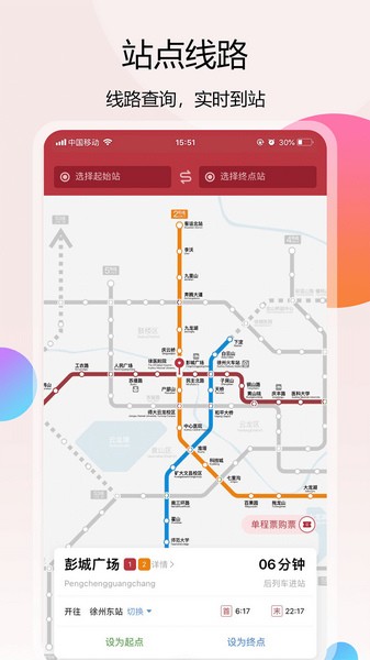 徐州地铁app官方版是一款专为徐州地区居民用户地铁出行准备的便民生活服务类应用软件。这款软件为用户提供更加便利的地铁出行,用户可以使用软件查询所有正在运行的地铁线路,输入目的地和出发地即可智能推荐地铁出行乘坐方案,多种方案供用户选择。同时,用户可以查询到每条线路的运营时间时刻表,避免错过最后一班车的尴尬,方便用户规划好时间路程。用户在登录软件并实名认证后可以使用扫码功能来快速上车,多种线上支付方式可选用,无需排队购票即可进站。此外,用户还可在软件上查询最新的地铁官方资讯,官方公告都会及时同步更新发布在软件上,将重要的消息推送给用户,让用户能够及时知晓变动。除了这些,地铁沿线周边的各类娱乐场所、景点、商店等信息都有收录,并且将位置信息标注在地图上,绘制成一份可供参考的游玩指南。用户还能够通过手机来预约徐州地下遗址博物馆,在手机上查看各个展馆的讲解视频,对展品有较为详细的了解,感受徐州这个城市的历史文化沉淀。