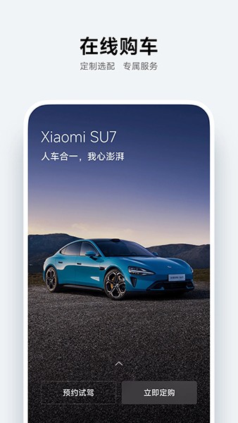 小米汽车app内置了购车、买车等功能,用户可以通过app了解小米汽车的核心亮点和技术参数,可预约试驾、配置订购自己的小米汽车。
