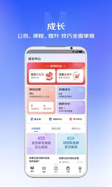 消息中心:商品信息、订单信息、官方公告等,第一时间推送到手机。与买家沟通更便捷,支持消息多端统一,更快响应。