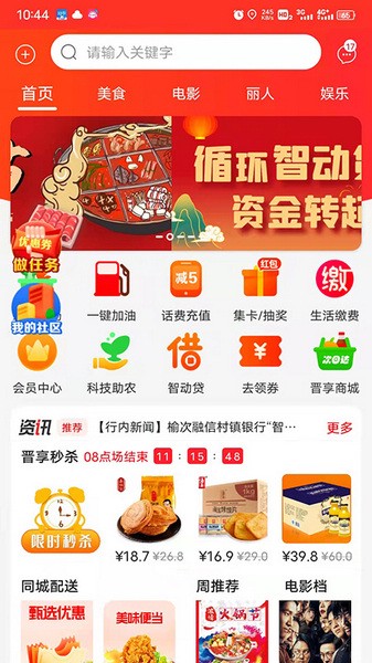 晋享其中app最新是一款非常适合晋中人民来使用的软件,囊括了购物、外卖以及加油、话费充值等在内的一系列本地服务,让大家的生活变得更加舒适便捷。软件界面清爽简洁,使用也非常的简单,每天都有超值商品的秒杀服务,大家可以用更实惠的价格买到更好的商品。此外,大家也能够在这里了解电影场次并一键购买电影票等等,业余生活也变得更加精彩。