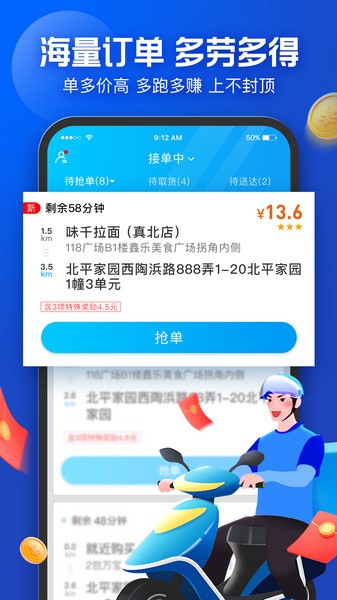 抢单取餐送达:卡片列表页/运单详情页/推荐单卡片页均可进行操作