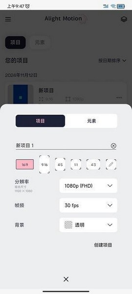 1、在本站下载安装好axcven剪辑软件最新版,运行软件并打开,先点击首页中间的加号,在这里能够进行项目的创建,根据自己的需求进行项目的命名、比例、分辨率、帧频以及背景的设置;