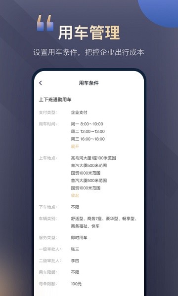 5、行程管理:通过企业出行的行程可以提前安排好用车事务;