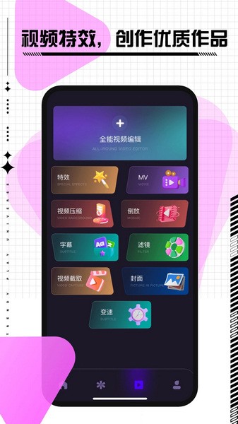 -- 特效功能、MV制作、视频压缩、倒放、字幕添加、滤镜选择等,都让你的视频作品更具个性。