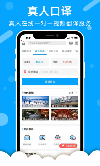 3、在跟谷歌翻译,有道翻译,搜狗翻译,微软翻译,讯飞翻译的竞争中,我们更推出了真人实时在线视频翻译,让您随时随地找到口译人员帮您高效,99.9%的准确性来解决您的深度翻译需求。我们支持中文,普通话,粤语,闽南语,英语,日语,韩语,后期我们将继续推出法语,德语,阿拉伯语,俄语,葡萄牙语,西班牙语,泰语,芬兰语,意大利语,保加利亚语,捷克话,荷兰话,希伯来语,波斯话,马耳他语,越南语,乌尔都语,波兰语,印尼语,马来语,老挝语,缅甸语,文莱话,菲律宾语,朝鲜语,乌克兰语,维吾尔语,哈萨克语,藏语,柬埔寨话,瑞典语,土耳其语,马来话,加泰隆语等100多种语言的真人实时在线翻译。