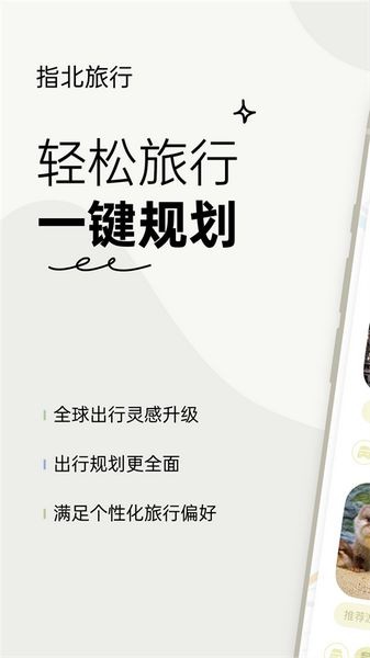 指北旅行app是一款界面干净简约的旅游攻略软件,它可以帮助擅于计划的用户理清自己的思绪,更好更快的为自己的旅行作计划,也可以帮助并不擅长计划的用户,通过ai技术,根据用户提供的关键词制定计划,参考网络平台上各式各样的旅行攻略进行整合,并提供相应的建议,让用户更能更为便捷的完成自己的计划。