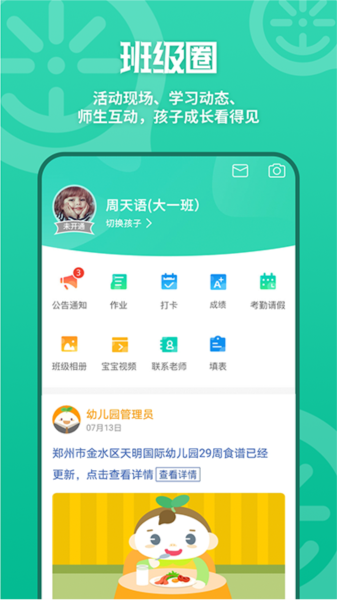 吃饭香喷喷,睡觉美甜甜,游戏很快乐,生日好开心,你想看的班级圈里都有!家长也能发班级圈,孩子在家表现怎么样,赶快分享给老师。