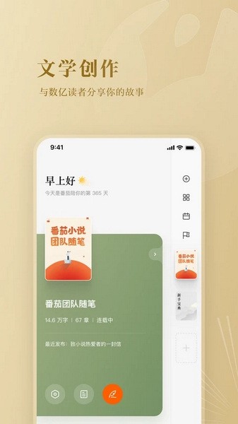 番茄作家助手app是一款专为小说作者们打造的实用写作工具,大家能够在这里快速高效的完成每天的写作任务和写作目标。大家还能够借助这款作家助手来将最新的存稿一键发布至番茄小说平台上,软件还设有资讯平台,用户能够随时随地向网站编辑咨询并了解当天的作品动态以及点击情况等。大家还能时刻在这里记录自己的写作灵感,从而更好的进行创作。