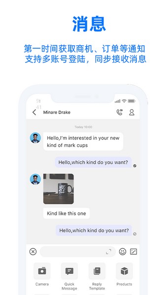 2、询盘:新询盘实时提醒,查看并回复询盘,查看买家profile和行为数据,客户商机一手掌握。