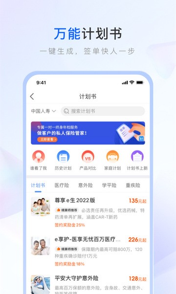丰富多彩全方位的保险理财产品,随时策划书制做,更增加30款保险理念,40款商品特点,更形象化的权益演试,都随电子名片分享,能看懂,能了解,开展业务的更安心!
