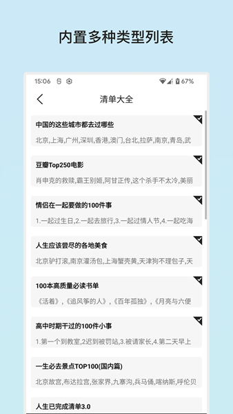 软件的功能很丰富,包括尝遍各地美食、一生必去的景点、情侣间的100件小事等等。这些清单不仅能提醒自己完成目标,还能和家人朋友分享生活点滴,增进感情。特别是自动倒计时功能,可以避免错过重要的日子,比如生日或者纪念日。