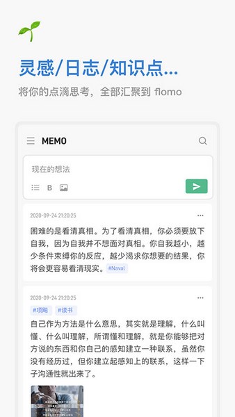 【新增】每日回顾支持推送。许多宝贵的想法,都值得被再次记起。现在,你无需再主动打开 App,flomo 会在恰当的时候,将你过往的记录推送给你。让每一次回顾,都成为一次灵感的重逢。