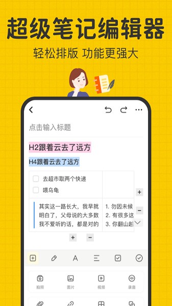 轻松排版,信息流文本字号字间距自由控制,极大限度的满足您对记事体验的延展需求,功能更强大。