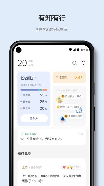 有知有行app是一款非常适合投资者使用的软件,大家不仅可以在这里记录自己的投资项目和账户配置,也能够了解到最新的金融市场资讯,从而及时做出理智的投资决策。便捷的投资记账功能让大家使用起来也更加的方便,存款与负债情况也都一目了然,用户们可以轻松掌握自己当前的账户情况。丰富的投资理念与相关的理财课程也能够帮助大家增长收益。