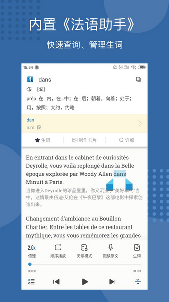 学习法语其实最重要的就是多听,这款app不仅提供听力练习,还配了中法双语的译文,方便理解。还有划词查词功能,长按单词就能翻译还能看例句,特别实用。播放速度有8档可调,循环模式也有4种,完全可以根据自己的水平来选择。