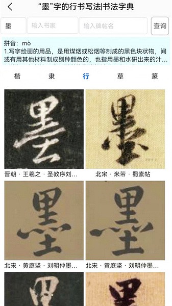 1、碑帖单字,把经典书法碑帖截成单字图片,配上米字格,每页展示一张,更方便、更准确的在手机端读帖、临帖