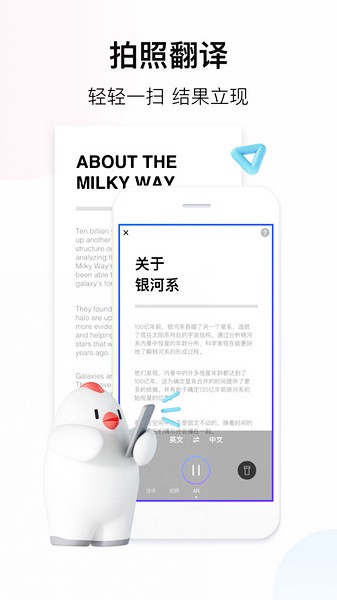 - 语音/对话翻译:实时语音翻译,支持中、英、日等21种热门语言的语音输入,更有英文口语打分纠音,助力口语提升。